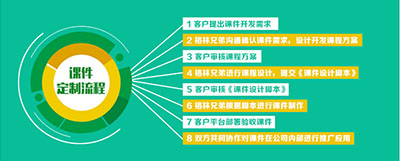 格林科技的課件定制流程為:客戶提出課件開發需求/格林兄弟溝通確認課件需求,設計開發課程方案/客戶審核課程方案/雙方共同進行課程設計,確定《課件設計腳本》/客戶審核《課件設計腳本》/格林兄弟根據腳本進行課件制作/客戶平臺部署驗收課件/雙方共同協作對課件推廣應用!