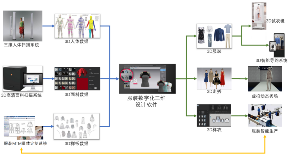 服裝設計一體化(數字化三維)仿真教學實訓室是集三維人體掃描、服裝設計系統、面料仿真設計系統、3D走秀系統以及3D試衣鏡展示功能為一體,可以促進學生更好的進行服裝設計一體化虛擬仿真操作,可直接跟設計一體化課程對接進行深度優化教學的方案。